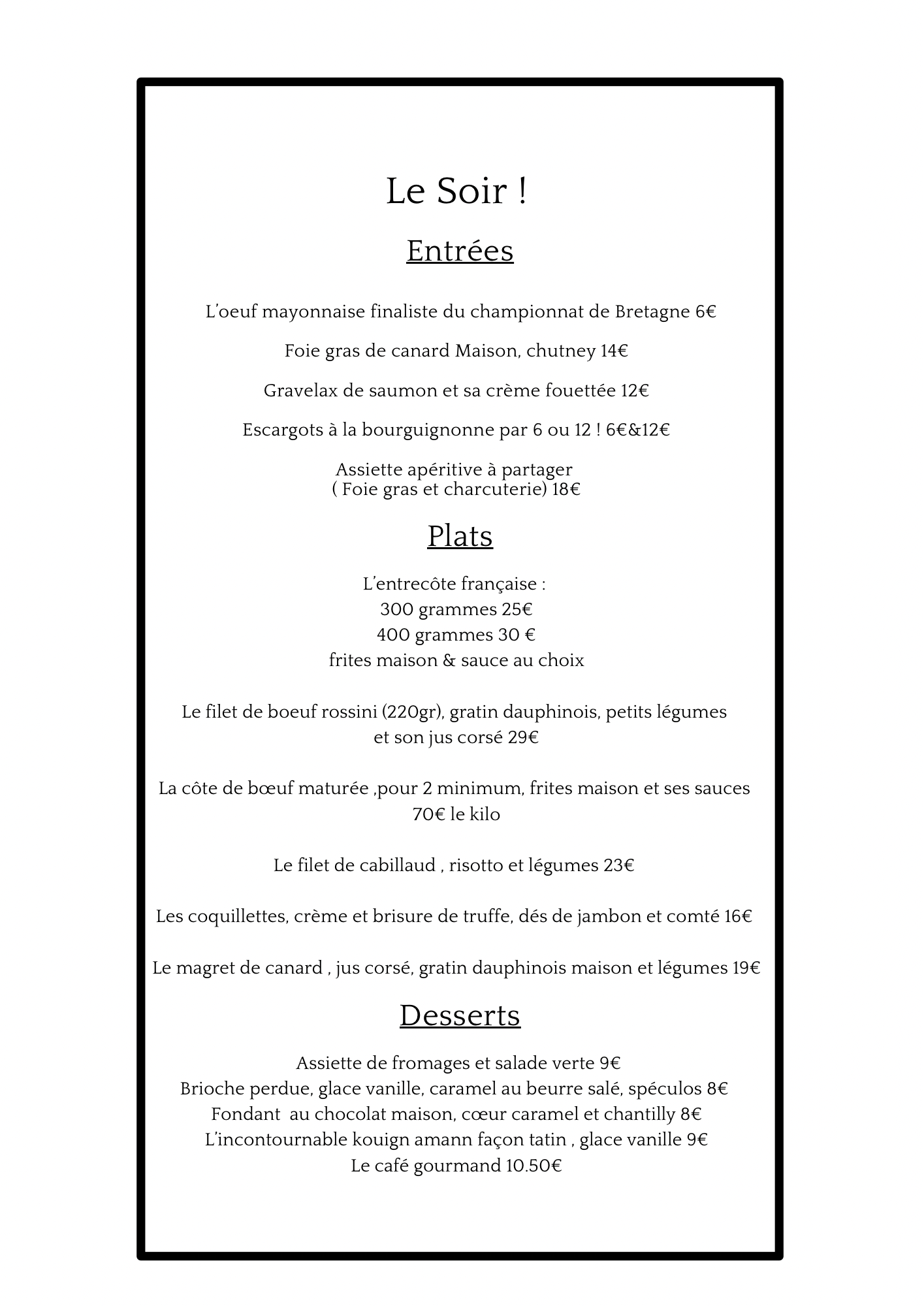 Le service du soir vous invite à découvrir notre carte raffinée, où les viandes d’exception sont à l’honneur : sélectionnées avec soin, maturées et sublimées par nos chefs. Et pour les amateurs de produits de la mer, ne manquez pas notre plat retour de pêche locale, préparé selon l’arrivage du jour.