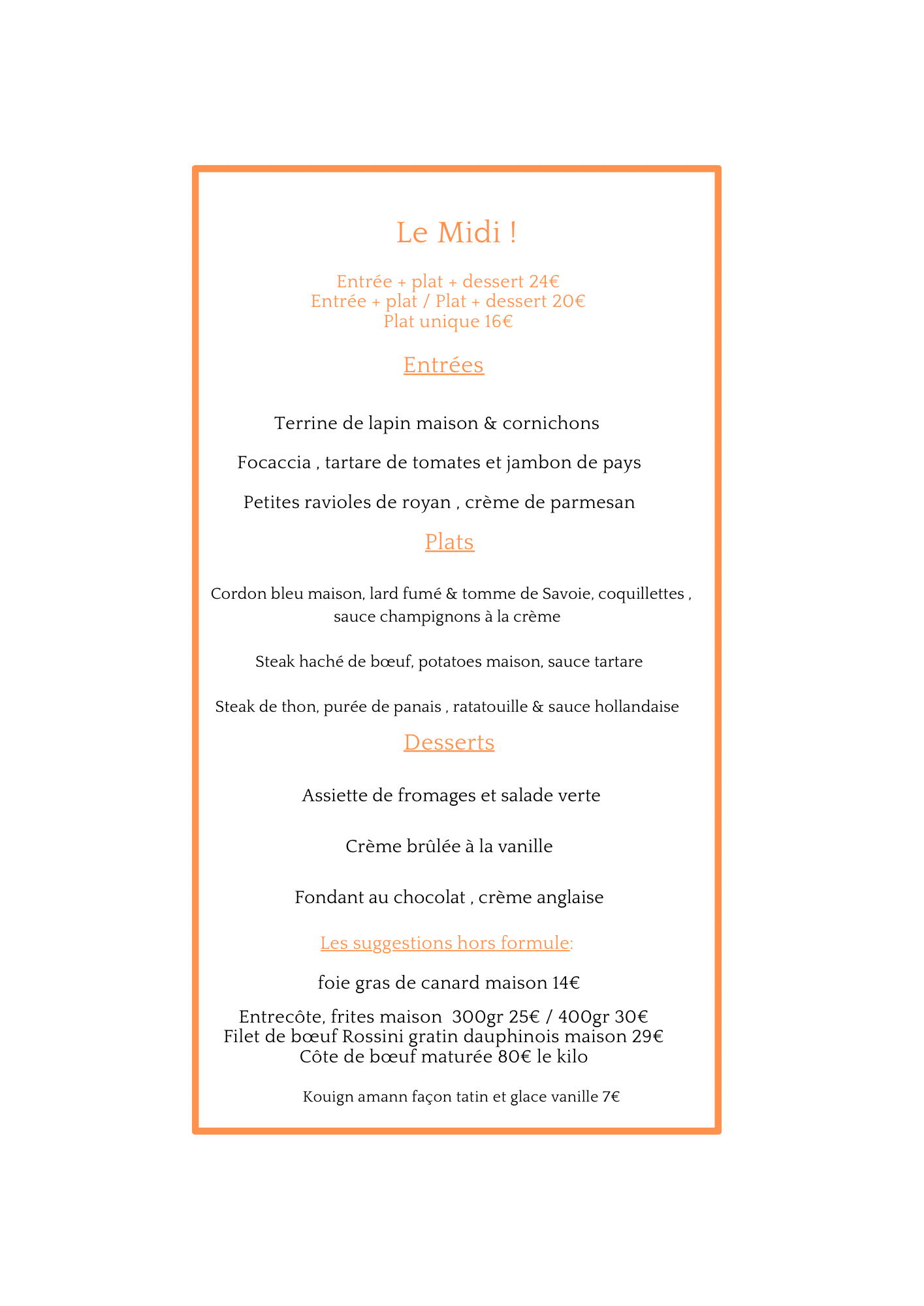 Chaque semaine, découvrez une nouvelle formule du midi, avec plusieurs choix d’entrées, de plats et de desserts, pour varier les plaisirs :