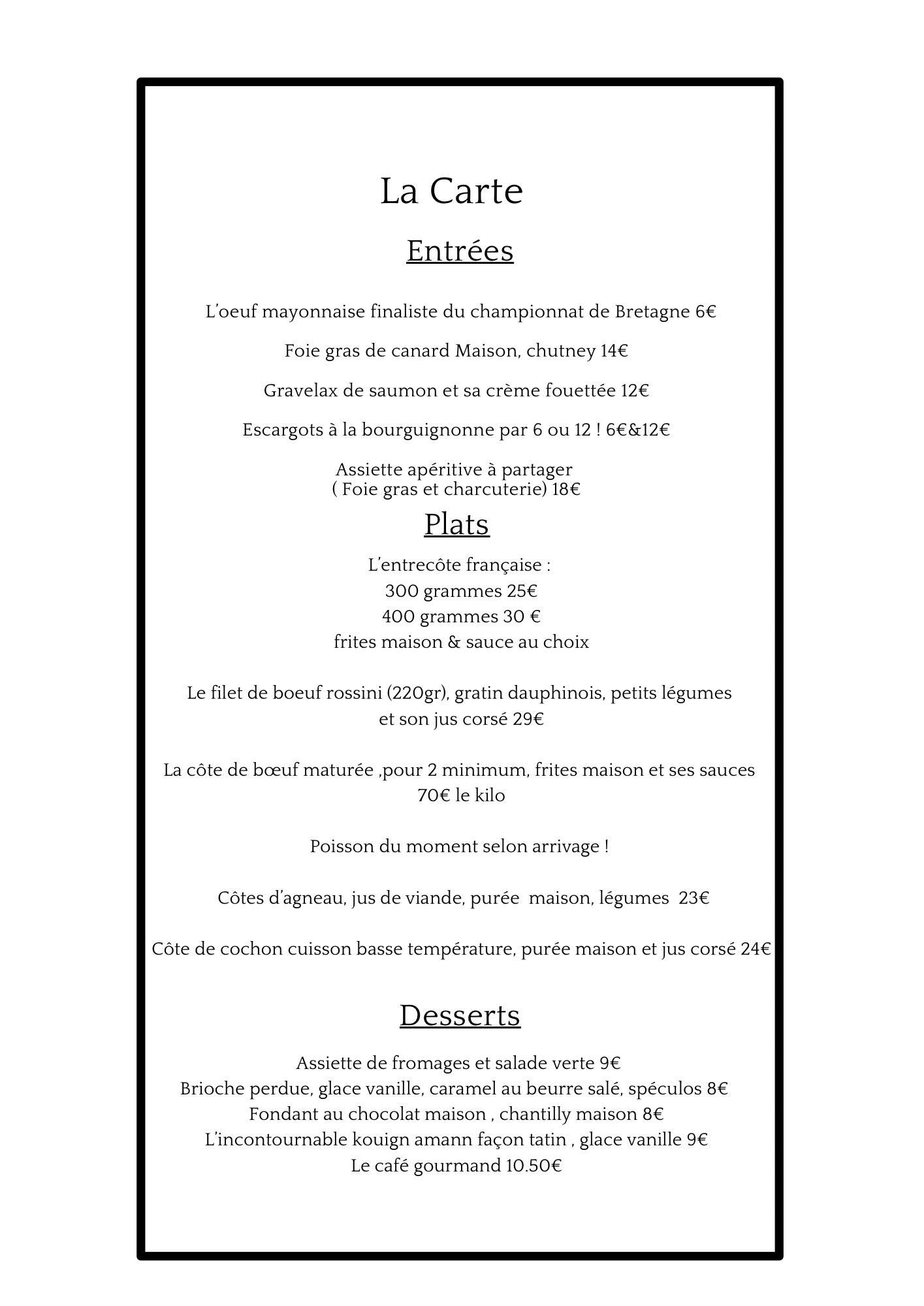 Aux commandes de la salle, Béatrice et Briac vous accueillent avec chaleur et bonne humeur, pendant que Mickaël et Guillaume œuvrent en cuisine pour vous régaler. Ici, la cuisine traditionnelle française est mise à l’honneur, avec des produits frais, de saison et une sélection de vins de qualité soigneusement choisie pour accompagner chaque plat.